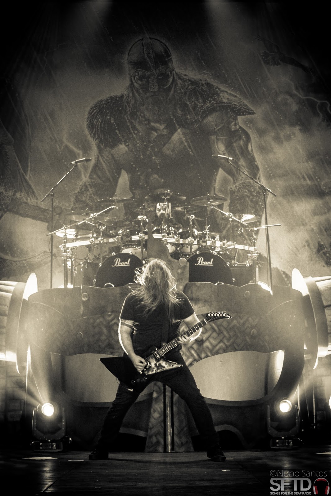 Antes de mais há que orar a Odin para que nos guie na batalha que acabara de se iniciar, por isso começaram por ‘The Pursuit of Vikings’ e logo se percebeu que estavam destinados a conquistar terras lusitanas, pilhando o carinho e dedicação do público. Segue-se ‘As Loke Falls’ e ondas de metal horns rebentam contra a proa do Dracar nórdico. O vocalista Johan Hegg aproveita um momento de acalmia para num bom português de sotaque sueco agradecer aos presentes com a simpatia de um nobre ancião antes de com toda a ferocidade viking iniciar a narração do momento em que matou o primeiro homem, na primeira viagem ao mais recente álbum com o tema ‘First Kill’. Prosseguindo pelo mesmo álbum ‘The Way Of Vikings’ traz para palco guerreiros que se gladiam para satisfação da plateia que se entusiasma com o eco do aço a ferir os escudos de madeira. Em ‘At Dawn’s First Light ‘ o público ergueu a sua voz enquanto arrancava um violento circle pit, que não perderia força durante todo o concerto. Abandonando o último trabalho surgia ‘Cry of the Black Birds’ numa altura em que já todas as músicas eram acompanhadas na voz pelo público, enquanto bravos guerreiros lusitanos no crowd surfing tentavam abordar o barco viking.
